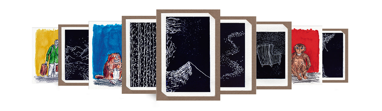 Daarnaast zijn er ook drukken van handgeschetste kaarten. Het zijn schetsen gemaakt met ecoline en houtskool.