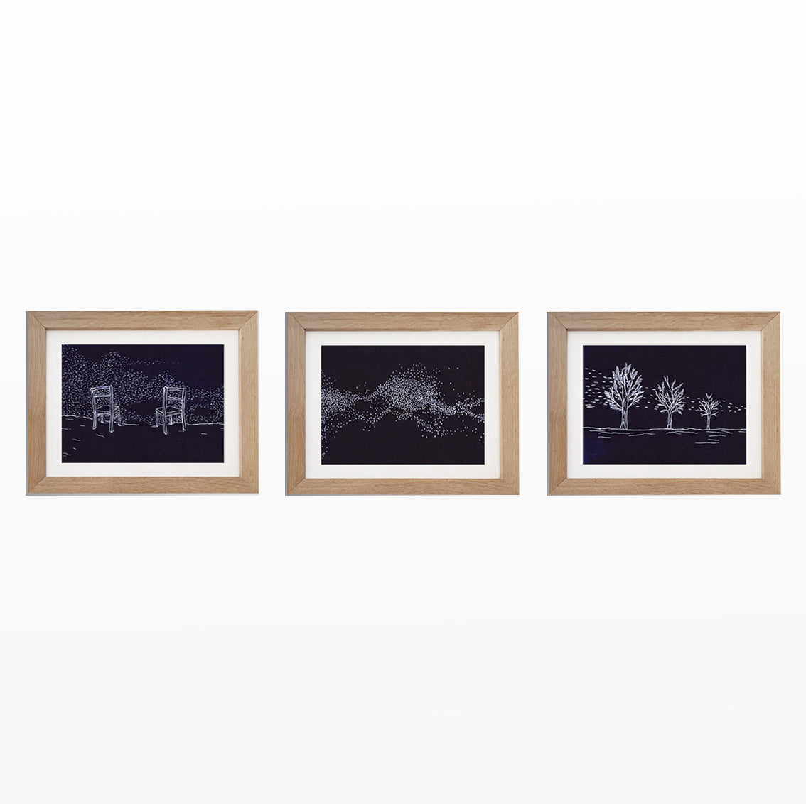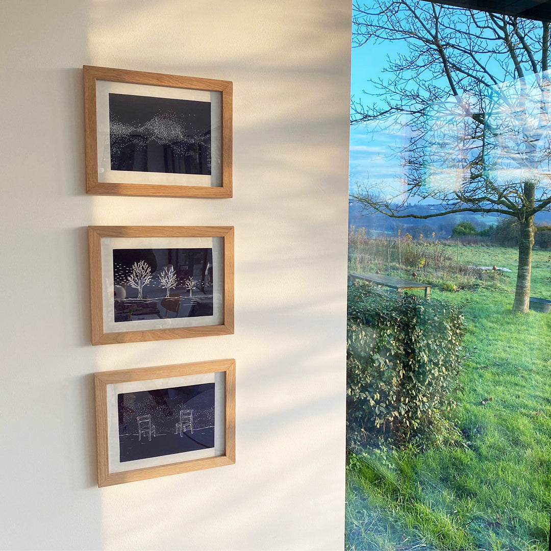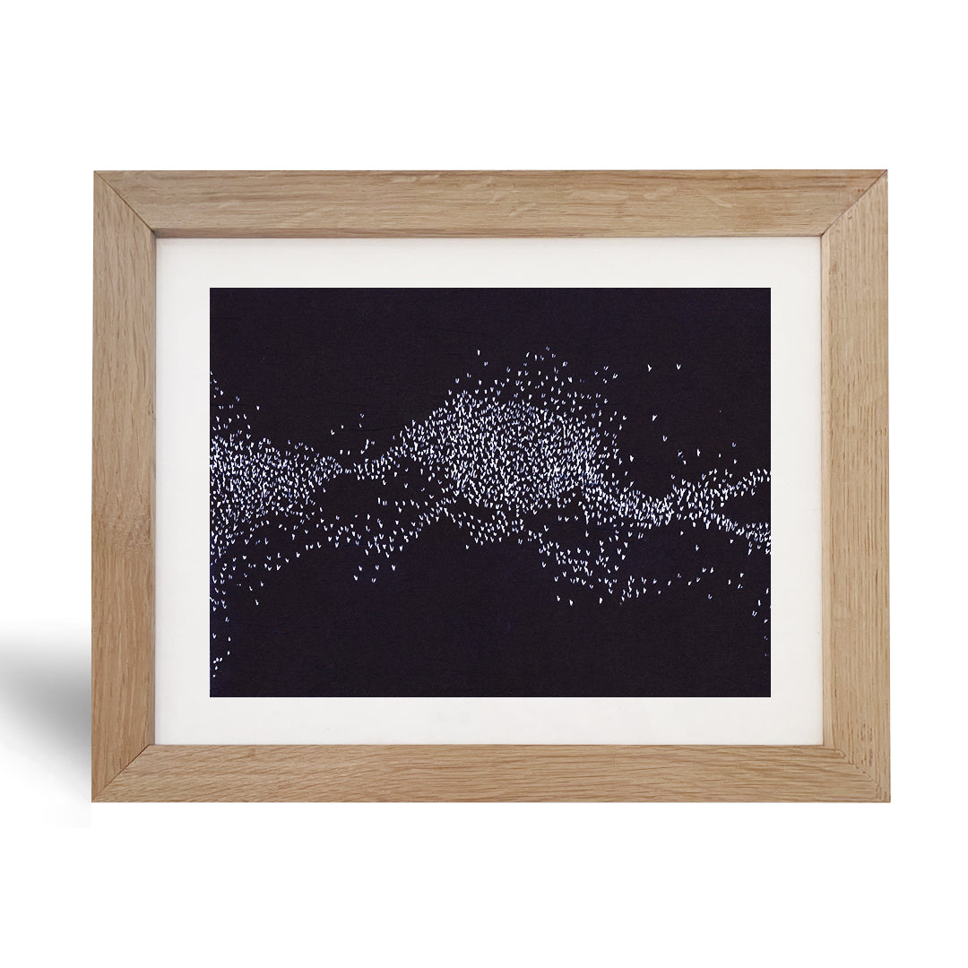 Eén linodruk genaamd 'spreeuwendans', geleverd met handgemaakte massieve eikenhouten kader en plexiglas. De kader heeft zowel een staander als een haakje.