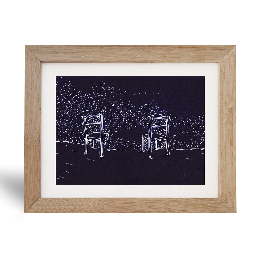 Eén linodruk genaamd 'stoelen', geleverd met handgemaakte massieve eikenhouten kader en plexiglas. De kader heeft zowel een staander als een haakje.